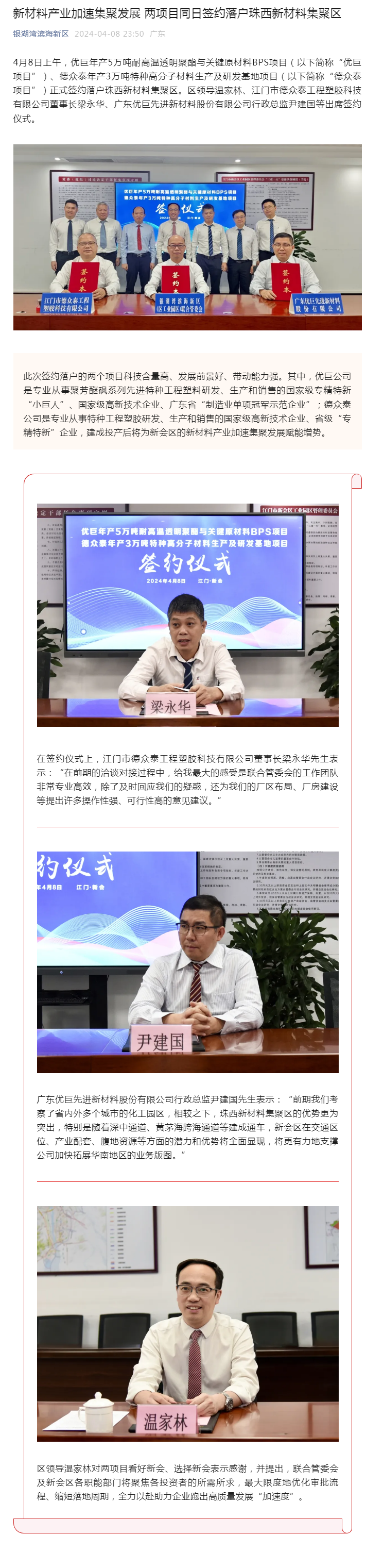 德眾泰年產(chǎn)3萬(wàn)噸特種高分子材料項目正式簽約落戶(hù)珠西新材料集聚區