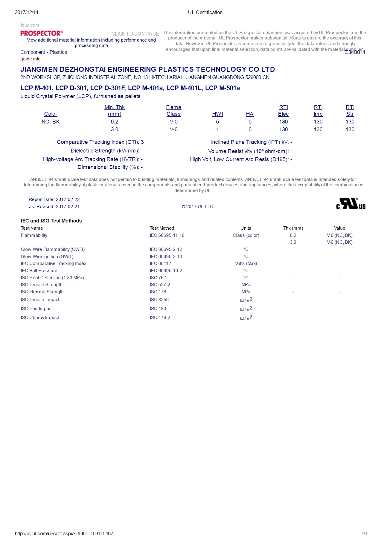分子鏈由大量芳環(huán)構成,火焰中由于表面形成一層泡沸炭而窒息火焰,因此不加阻燃劑, LCP也具有自熄性,極限氧指數約35%,阻燃性可達UL94 V-0級水平。德眾泰LCP產(chǎn)品最薄可以成型0.2 mm厚度的薄壁制品,并通過(guò)了UL94 V-0認證。